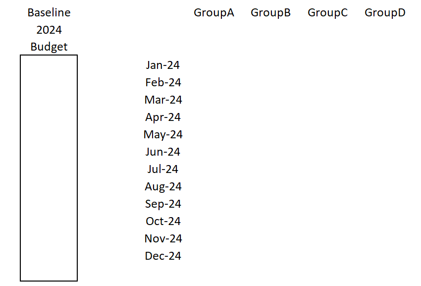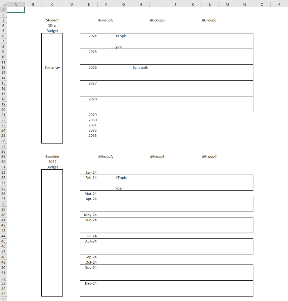 The second table (by months of 2024) is a presentation of the top-most blocked rectangle denoted by the year 2024. I gave it the unimaginative name of Baseline and remarked it as a Budget of the time in 2024. It works the same way as the first table by way of setting goals, however, it is a duty to now construct tasks that build-up to the annual goal of the first table. You can see that some months are blocked and others are not, only for illustrative purposes.