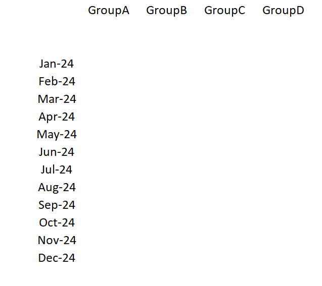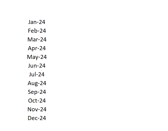 Now, go to column E and several rows down, type January, 2024. Click back onto the cell and find the bottom-right square handle to pull it down for autofill, all the way to Dec-24.