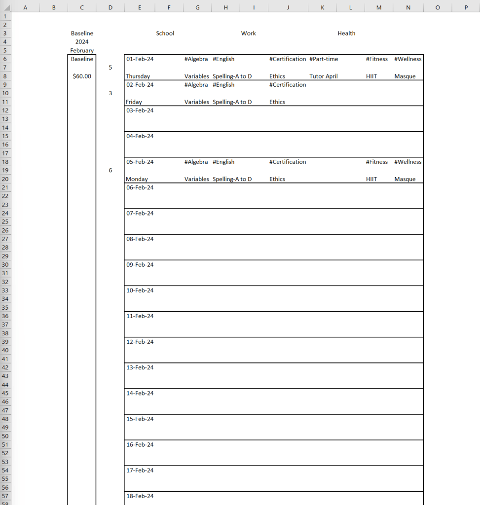 While completeness of data is a virtue, I want to say that there is no pressure to administratively overburden yourself with data entry. For example, if something is concretely within your routine or habit, then it is not necessary to include it on the basic schedule form. Or maybe your fitness routine requires a different type of tracker altogether, also possible in a new tab of the workbook.