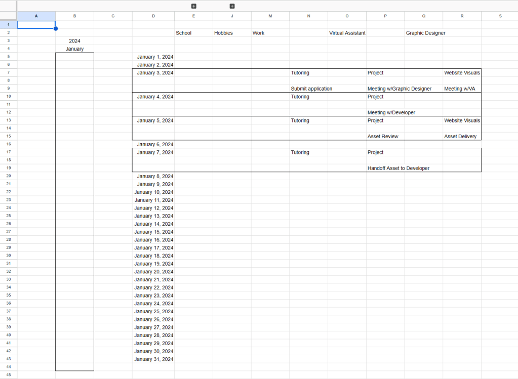 It lists a Virtual Assistant and Graphic Designer as part of the schedule across the Headings. The School and Hobbies sections are grouped to help visibility across a wide spreadsheet.